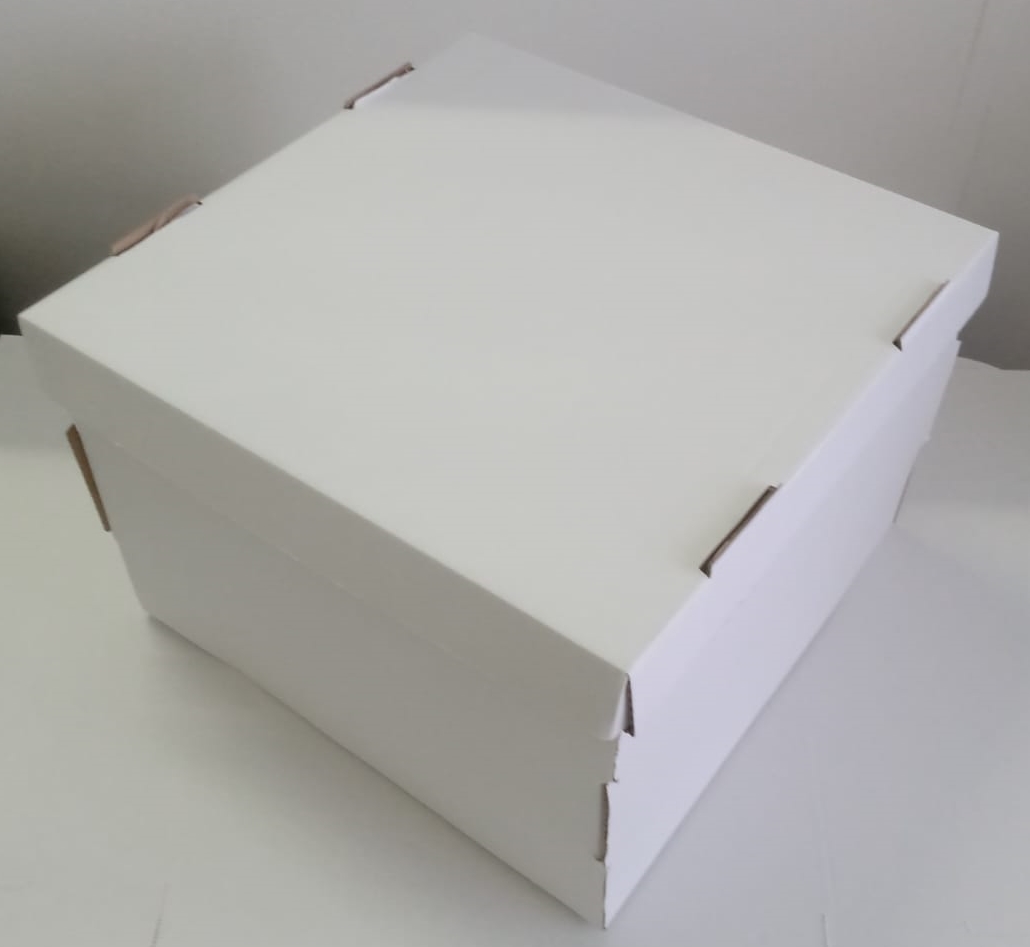 Caixas firmes e resistentes, feitas de Papelão Ondulado Branco, indicadas para o transporte de bolos e tortas.